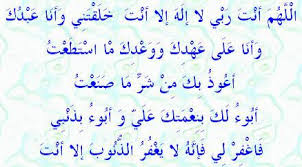 Maksudnya, ”Ya Allah Engkau adalah Tuhanku, Tidak ada sembahan yang haq kecuali Engkau, Engkau yang menciptakanku sedang aku adalah hambaMu dan aku di atas ikatan janjiMu (iaitu selalu menjalankan perjanjianMu untuk beriman dan ikhlas dalam menjalankan amal ketaatan kepadaMu) dengan semampuku, aku berlindung kepadamu dari segala kejahatan yang telah aku perbuat, aku mengakuiMu atas nikmatMu terhadap diriku dan aku mengakui dosaku padaMu, maka ampunilah aku, sesungguhnya tiada yang boleh mengampuni segala dosa kecuali Engkau”.