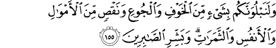 "Dan kami pasti akan menguji kamu dengan sedikit ketakutan, kelaparan, kekurangan harta, jiwa dan buah-buahan. Dan sampaikanlah khabar gembira kepada orang yang sabar (155). (iaitu) orang yang apabila ditimpa musibah, mereka berkata 'Innalillahi wa inna ilaihi rajiun*.. [sesungguhnya kami milik Allah dan kepadaNyala kami kembali]' (156) Mereka itulah yang memperoleh ampunan dan rahmat dari Tuhannya dan mereka itulah orang yang mendapat petunjuk (157)".